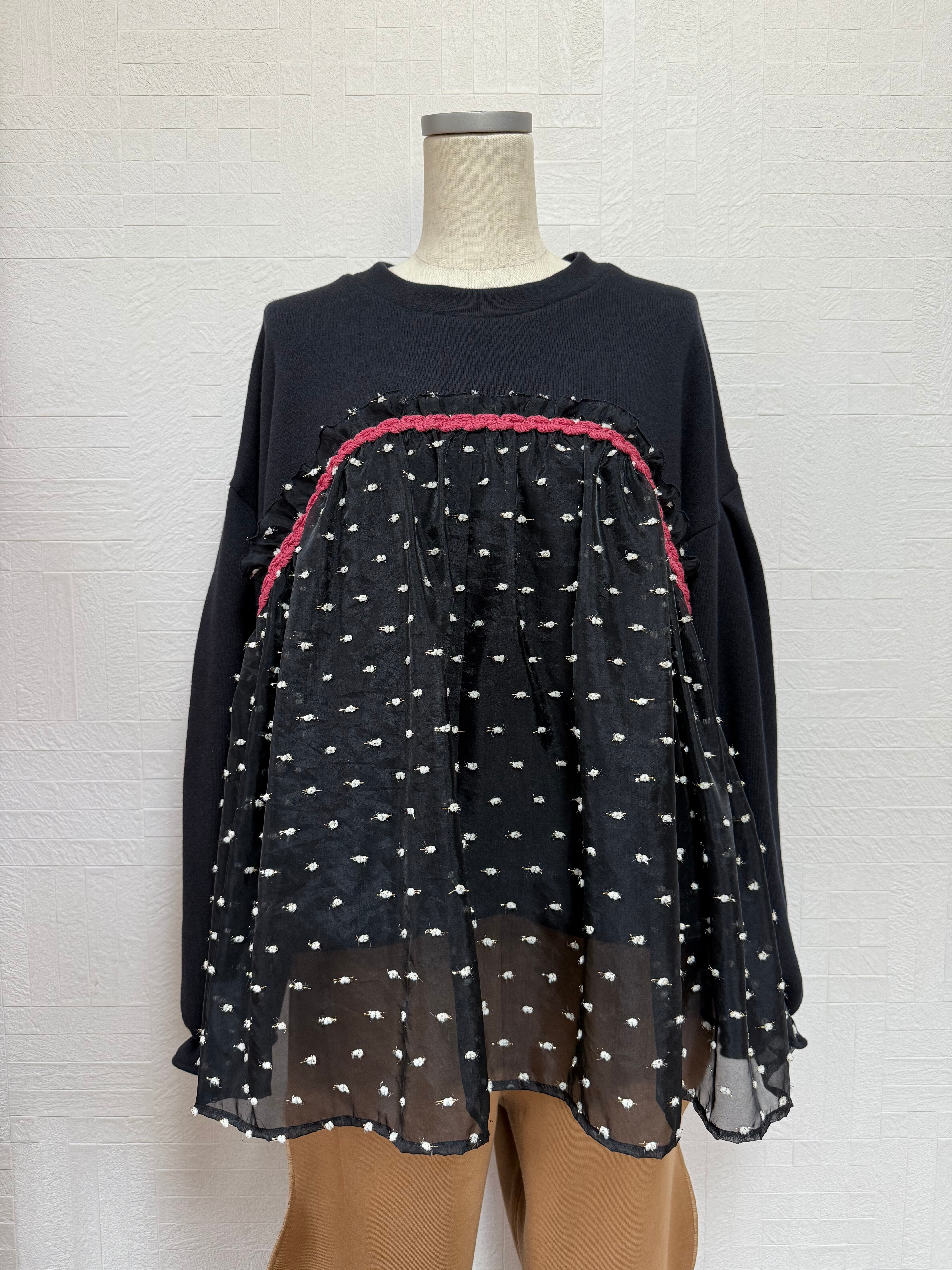 スウェット生地のドロップショルダープルオーバーにオーガンジーを重ねて、リラックスした着心地の中にも女性らしさを忘れないデザインに仕上げました❤️